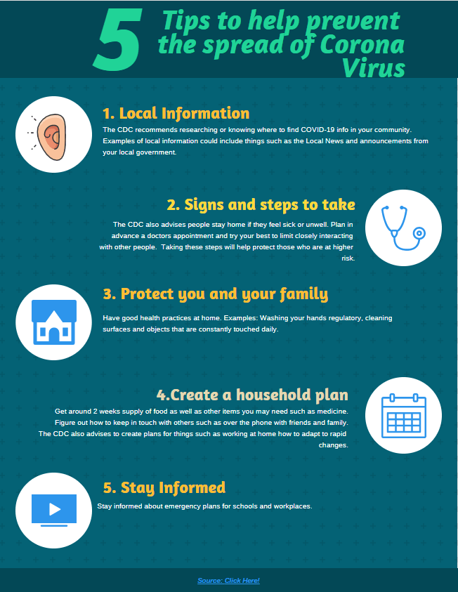 The CDC has been updating its website daily to keep people informed about the growing cases of Corona Virus in the United States. With many people worried about the proper steps to prepare for the growing pandemic, the CDC has posted some recommendations that people can do in order to help contain the spread of the virus. Here is a info graphic summarizing preparations that the CDC recommends you should do.